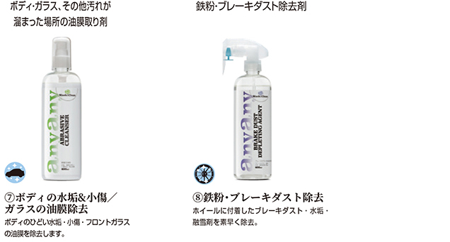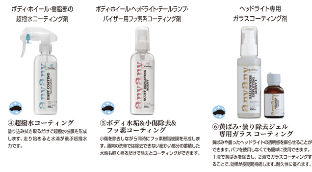 | ⑥ | 簡易メンテナンス溶剤 | anyany SALLOWNESS DEPLETING AGENT1・2 ヘッドライトクリーナーコーティングザイ |