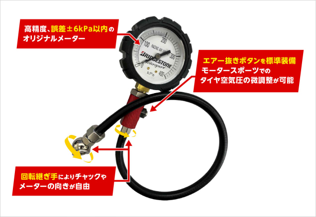 誤差±6kPa以内の高精度オリジナルメーターを採用。エアー抜きボタンを標準装備し、モータースポーツでのタイヤ空気圧の微調整が可能です。また回転継ぎ手によりチャックやメーターの向きが自由になることで、さまざまなシチュエーションに対応します。
